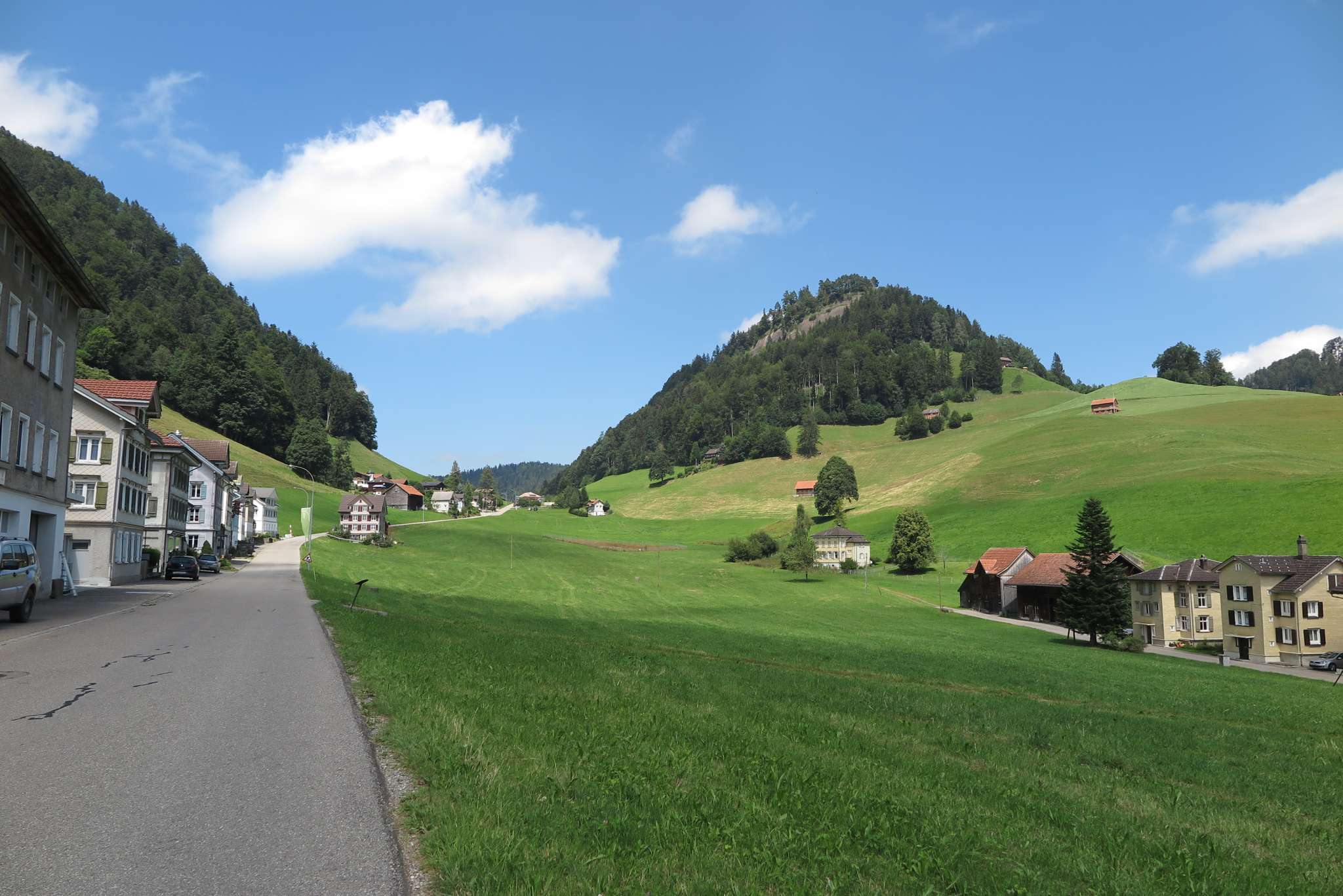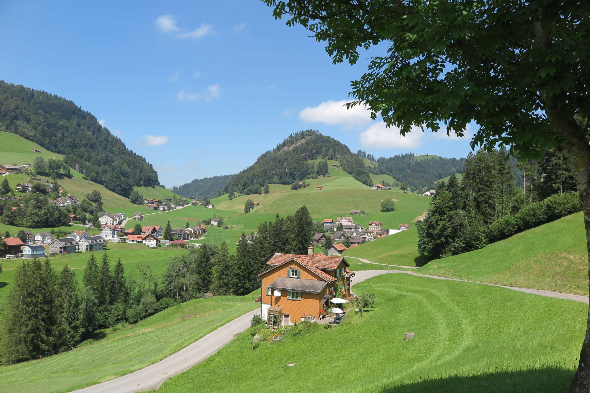 Dicken, ein ehemaliges Stickereidorf, gehört zur politischen Gemeinde Neckertal und hat ca. 350 Einwohner. Auf allen Seiten geht's über sonnenverwöhnte Hügel in die Höhe, was so manchen Wandervogel verzückt. Besonders stolz sind die Einheimischen auf die Wilkethöchi, ein lohnenswertes Aussichtsziel.