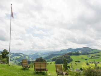 Das Kreuz Oberhelfenschwil ist ein herrlicher Ort. Die Aussicht rundherum ist fantastisch. Auf Holzliegestühlen, die an schönster Lage stehen, kann man das Panorama in aller Ruhe auf sich wirken lassen.