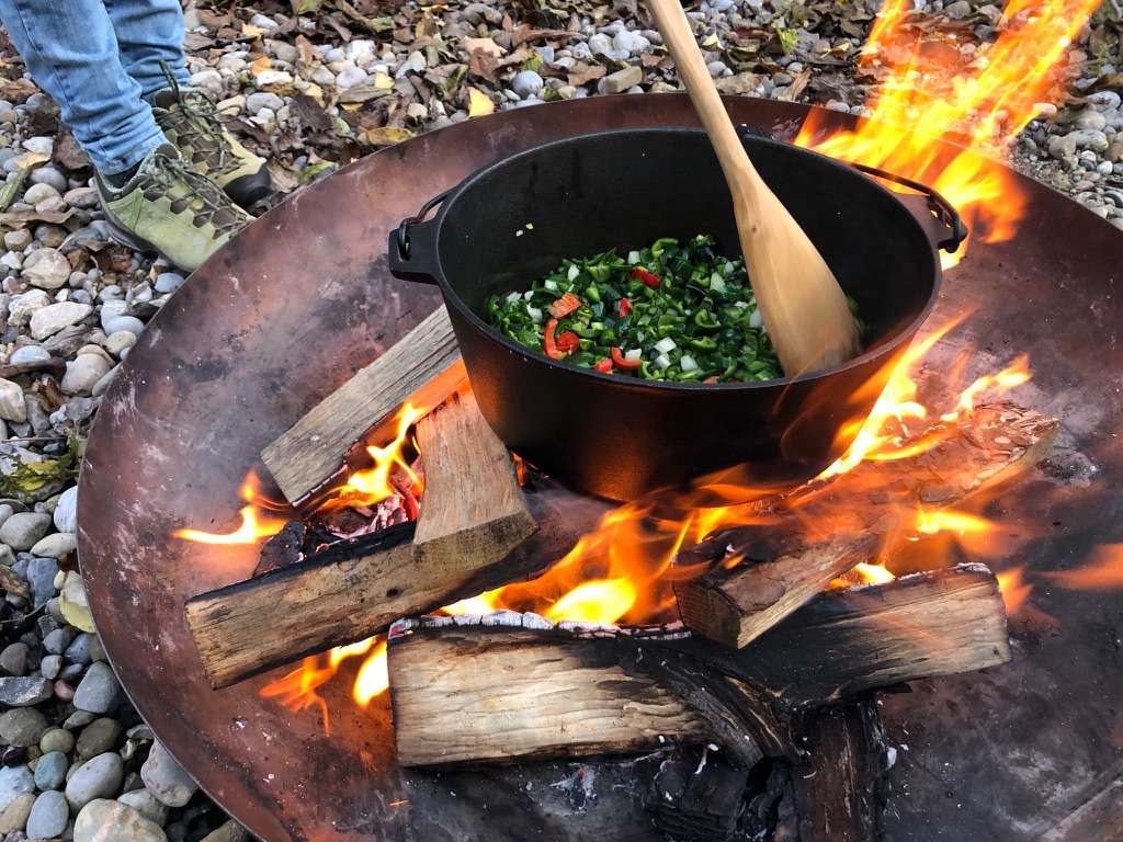 Draussen kochen am Feuer, im Team … das ist eine Herausforderung der besonderen Art: Zusammenarbeit, Absprachen und Timing sind da gefragt, auch wenn der Schein des lodernden Feuers noch so romantisch scheint.